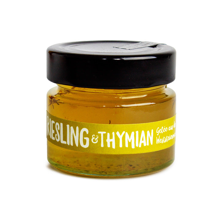 Normaler Preis € 5,90Zutaten Riesling (enthält SULFITE und Alkohol), Zucker, Thymian, Pfeffer, Geliermittel: Pektin, Säuerungsmittel: Zitronensäure. Weingehalt 50 g je 100 g, Gesamtzuckergehalt 60 g je 100 g.